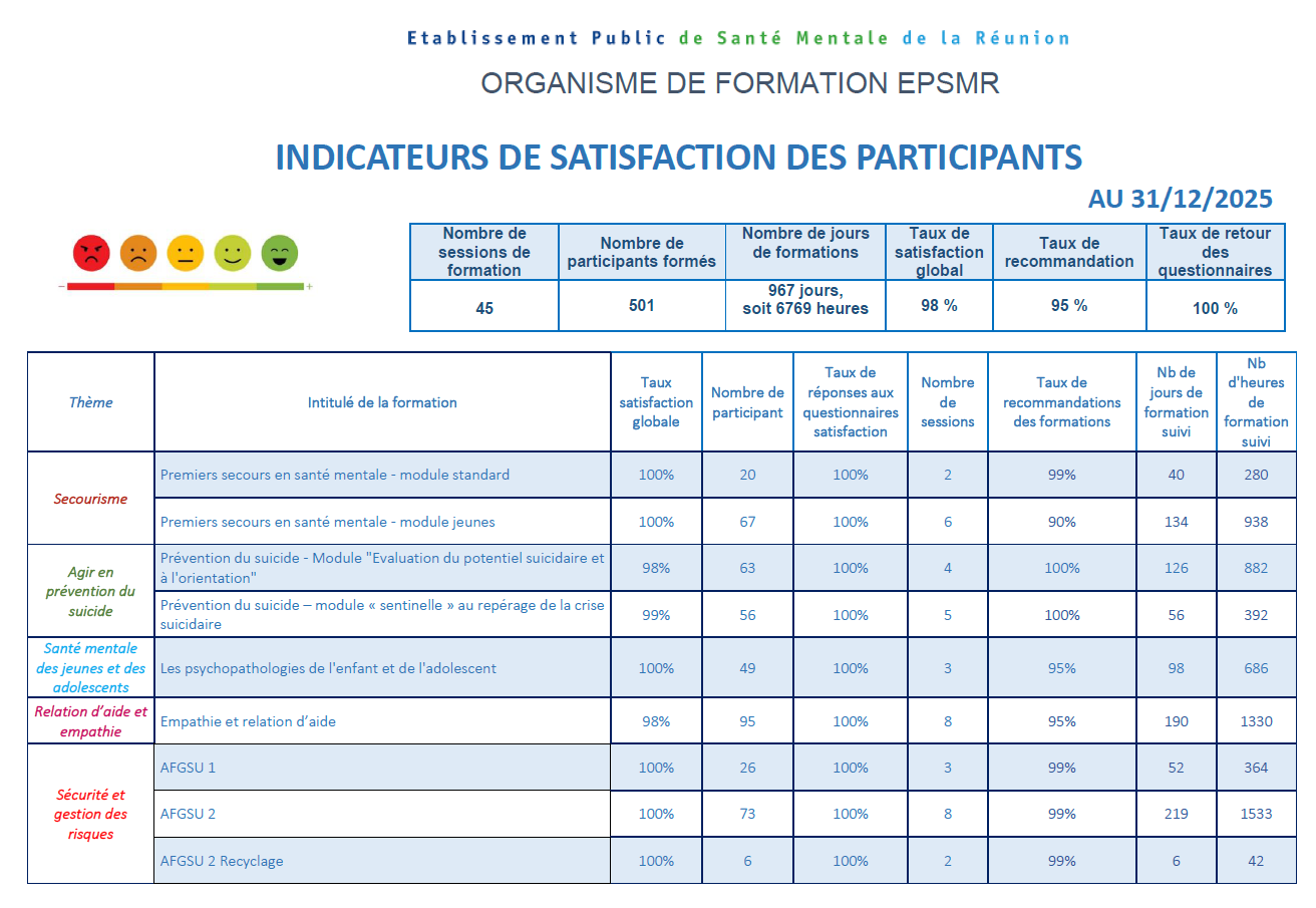L’établissement Public de Santé Mentale de La Réunion dispose d’un organisme de formation agréé de formation continue pour répondre aux besoins de formation des professionnels de santé, du médico-social et du social.